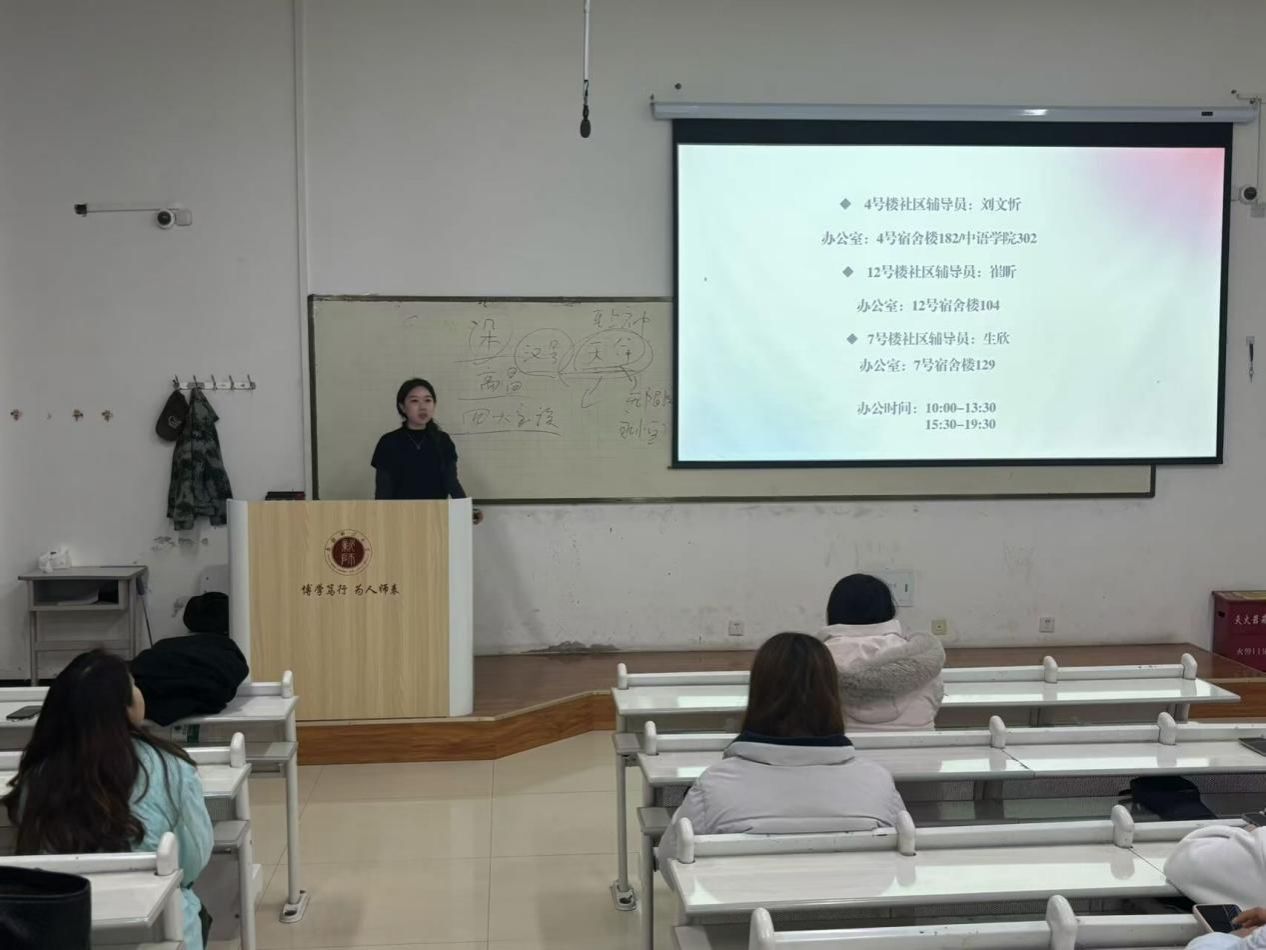 随后,社区辅导员公布了各宿舍楼对应的办公地点与工作时间,畅通学生咨询与反馈渠道。参会宿舍长一致表示,将积极落实会议要求,认真履行职责,团结宿舍成员共同维护安全、整洁、和谐的校园社区居住环境。