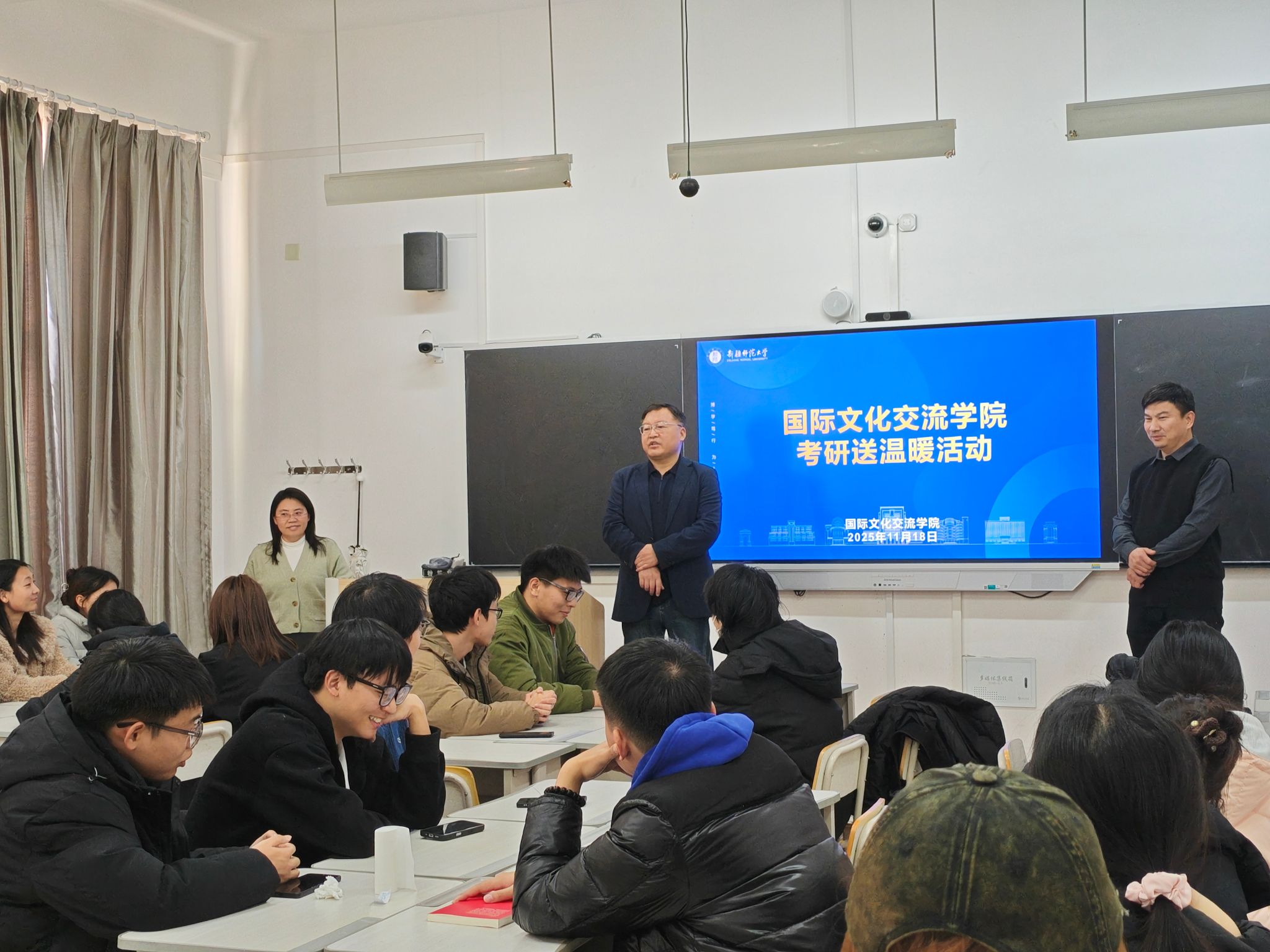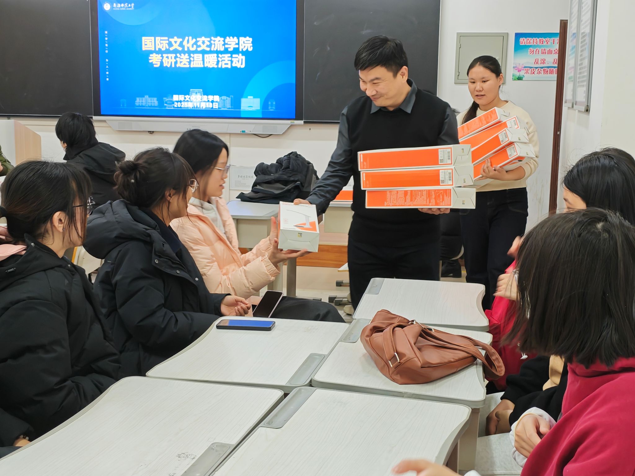 寒冬虽至,但梦想滚烫!11月18日,国际文化交流学院在二号教学楼310室为2026届考研人独家定制了一场“暖心充电”行动,学院党委副书记王辰、副院长刘伟乾和胡炯梅教授齐聚现场,为正在冲刺的考研人送上暖心关怀和能量补给!