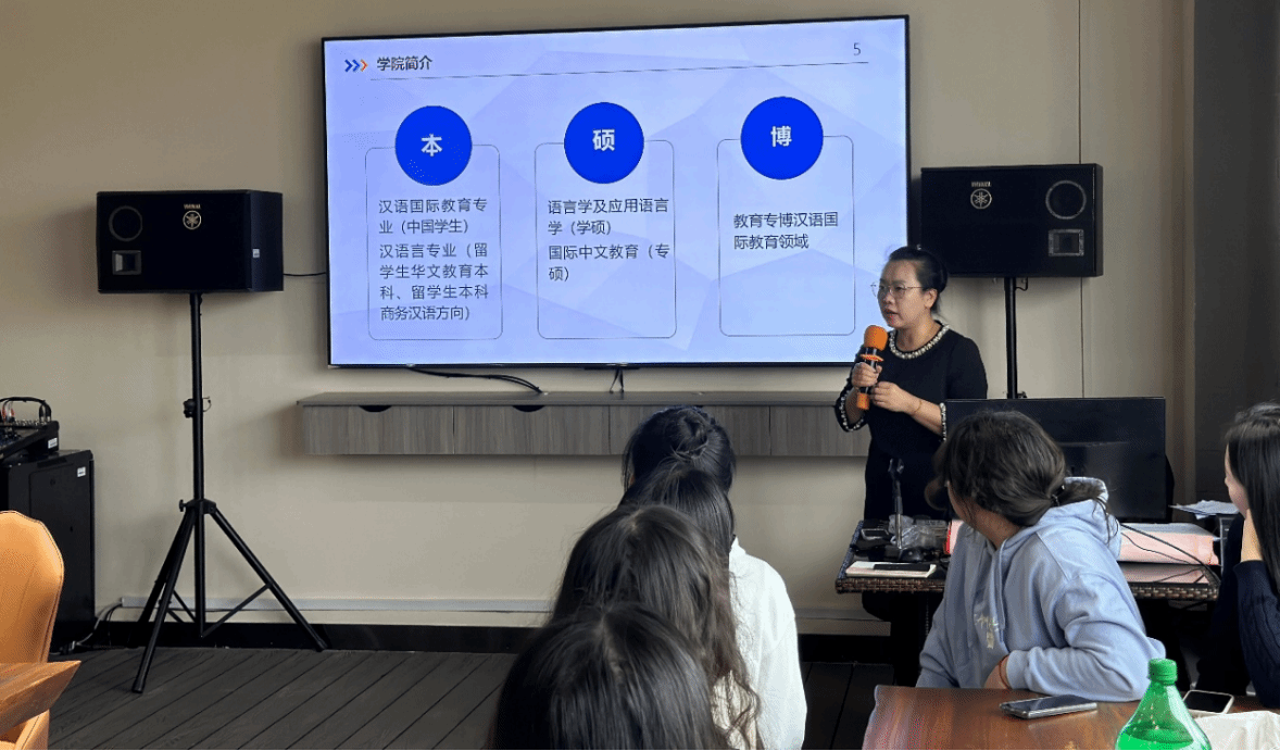 见面会伊始,邓新副院长代表学院向全体新生表示热烈欢迎,并勉励同学们珍惜宝贵的学习时光,勇于探索学术前沿,注重培养独立思考和科研创新能力。随后,李敬欢副院长与胡炯梅教授分别就国际中文教育、语言学及应用语言学两个学位点进行了全面而系统的介绍,帮助同学们深入了解专业特色与发展方向。