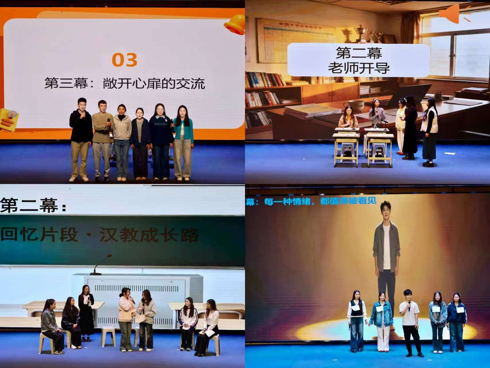 为进一步加强心理健康教育工作,丰富校园文化生活,引导学生关注自身心理状态,提升情绪管理、人际交往与压力应对能力,4月2日,国际文化交流学院在温泉校区学术交流中心道德讲堂举办“剧映心灵,向阳成长”校园心理情景剧比赛。本次活动由学院学生会自主策划实施,各班级踊跃参与,共有8支队伍参赛。学院辅导员米合热阿依、余金桀及专任教师孟玉凤博士担任评委,各年级学生到场观赛,现场气氛热烈。