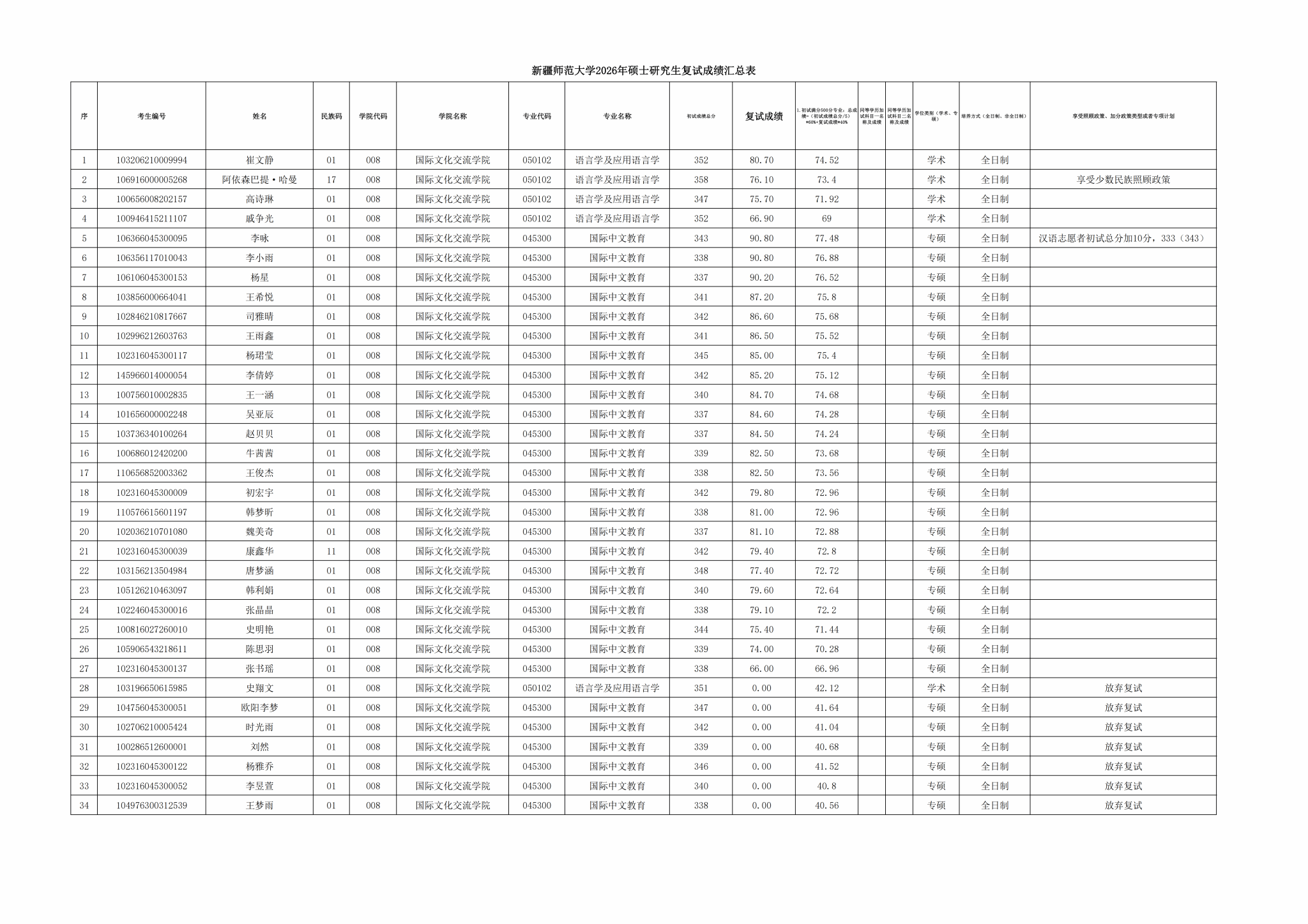 新疆师范大学国际文化交流学院2026年硕士研究生招生调剂复试工作已结束,现将成绩予以公示如下: